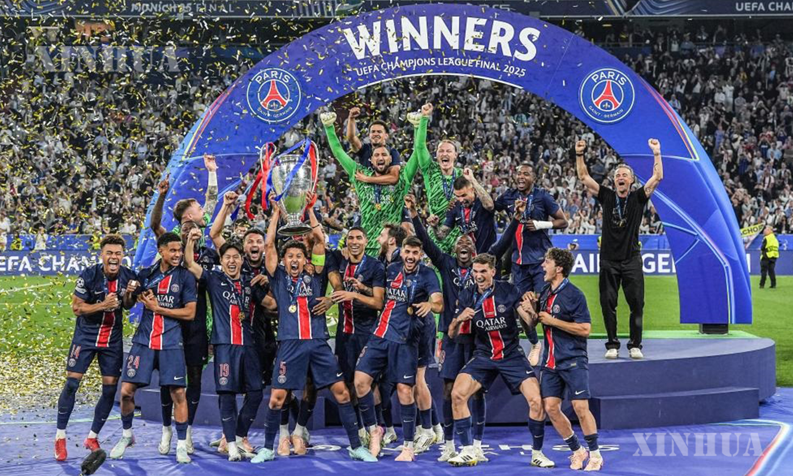 Head coach Luis Enrique (1st R) and Paris Saint-Germain players celebrate after winning the 2025 UEFA Champions League final against Inter Milan in Munich, Germany, May 31, 2025. (Xinhua/Peng Ziyang)