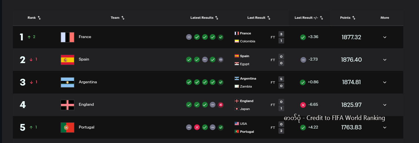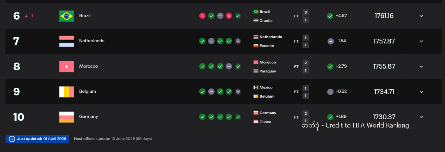 ဧပြီ ၁ ရက်၌ ထုတ်ပြန်ခဲ့သော ဖီဖာ ကမ္ဘာ့အဆင့်သတ်မှတ်ချက်စာရင်းတွင် ထိပ်ဆုံး ၁၀ နေရာအနက် နံပါတ် ၆ မှ ၁၀ အထိ တွေ့မြင်ရစဉ် (ဓာတ်ပုံ – Credit to FIFA World Ranking)