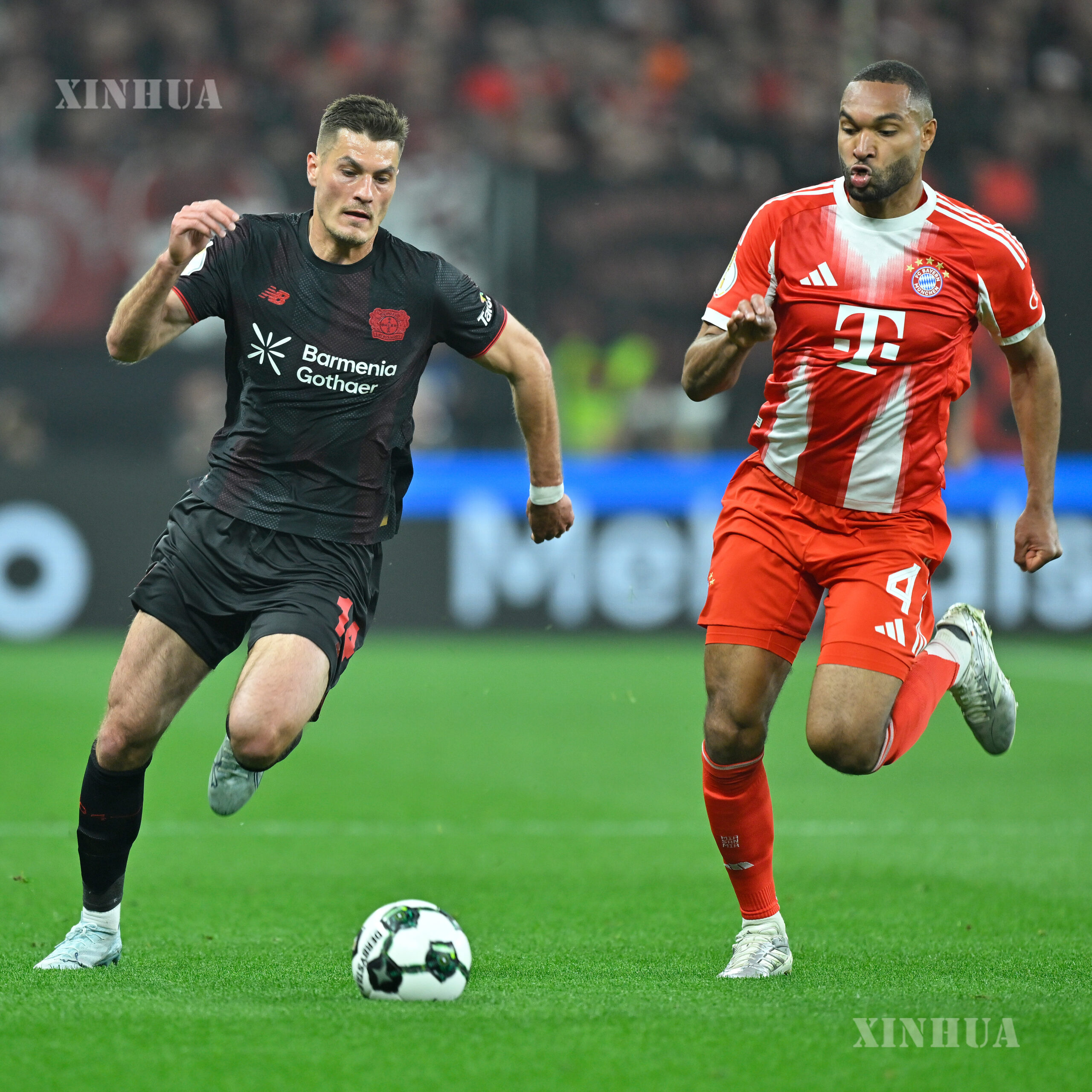 ဂျာမနီနိုင်ငံ လေဗာကူဆင်မြို့တွင် ၂၀၂၆ ခုနှစ် ဧပြီ ၂၂ ရက်က ဘိုင်ယန်မြူးနစ်အသင်းနှင့် လေဗာကူဆင်အသင်းတို့ ယှဉ်ပြိုင်ကစားသည့် ဂျာမန်ဖလား ဘောလုံးပြိုင်ပွဲ ဆီမီးဖိုင်နယ်ပွဲစဉ်၌ လေဗာကူဆင်အသင်းမှ ပက်ထရစ် ရှစ်ခ် (ဝဲ) နှင့် ဘိုင်ယန်မြူးနစ်အသင်းမှ ဂျိုနသန် တားတို့ ဘောလုံးယှဉ်လုနေစဉ် (ဆင်ဟွာ)