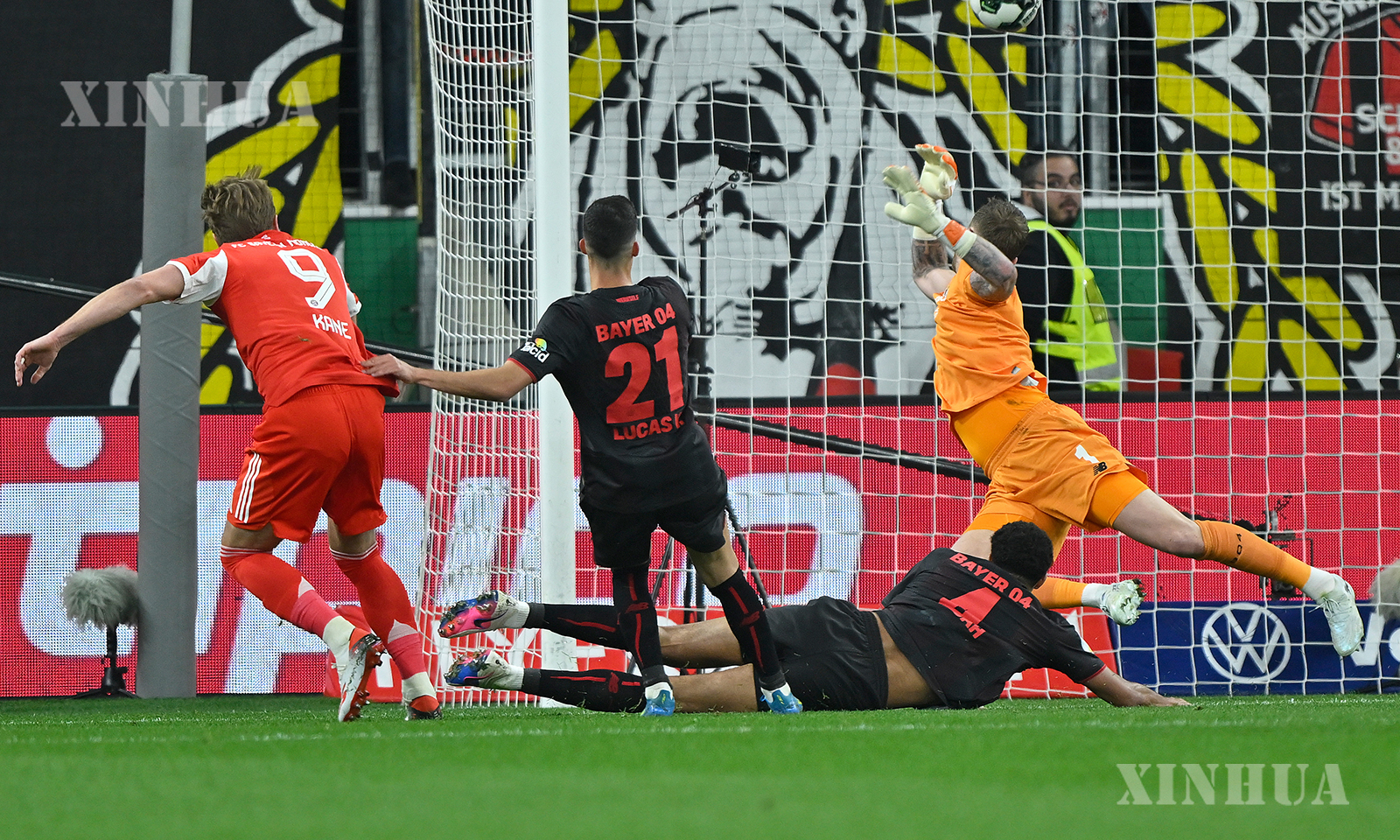 Harry Kane (1st L) of Bayern Munich shoots to score during the German Cup football semifinal match between Bayern Munich and Bayer 04 Leverkusen in Leverkusen, Germany, April 22, 2026. (Photo by Ulrich Hufnagel/Xinhua)