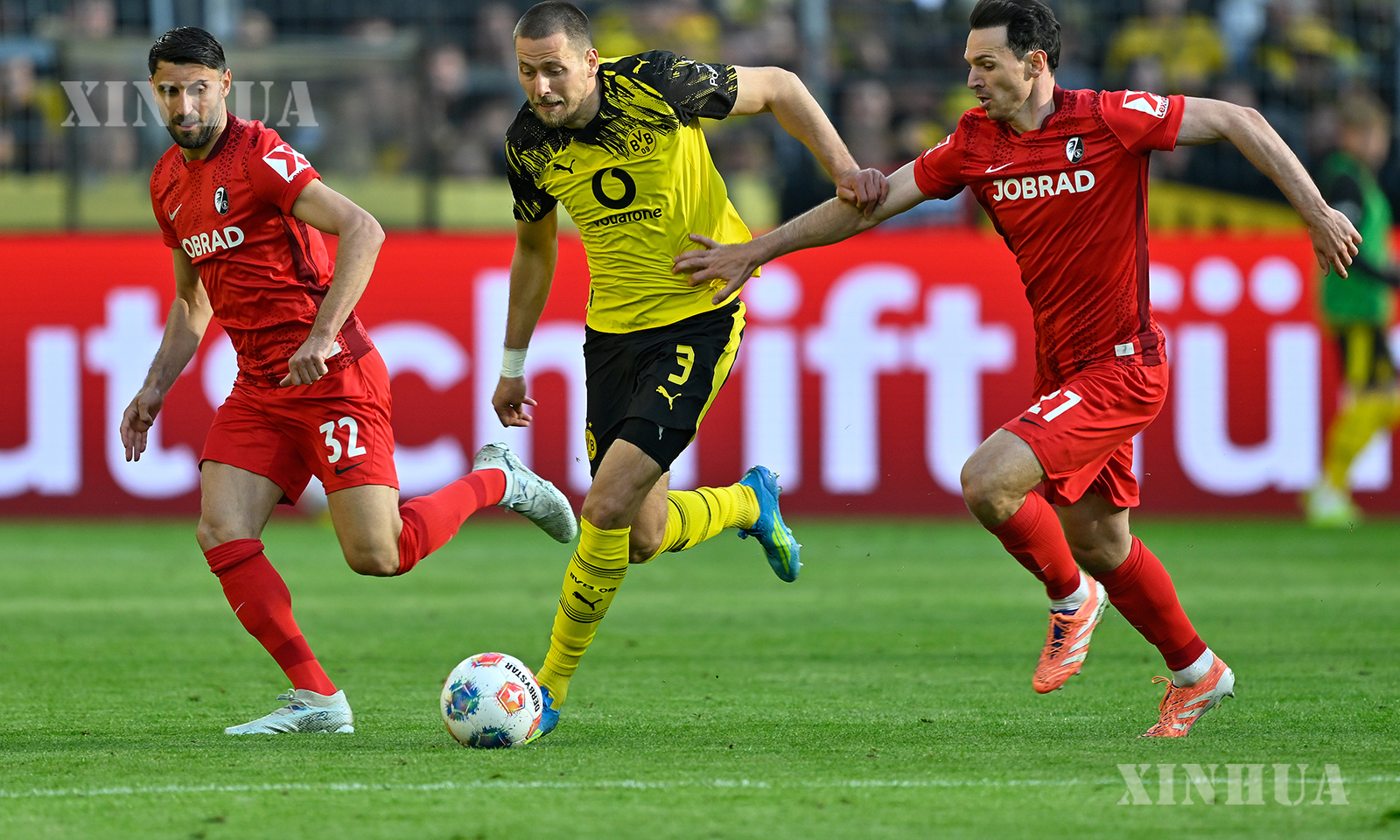 BERLIN, April 26 (Xinhua) — Second-placed Borussia Dortmund celebrated its 1,000th Bundesliga home match in style on Sunday, sweeping aside a rotated Freiburg side to secure qualification for next season’s Champions League.
