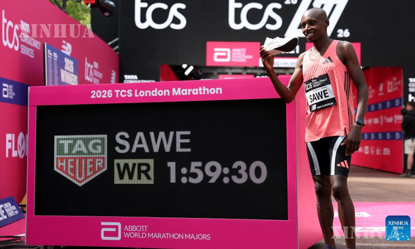 ဗြိတိန်နိုင်ငံ လန်ဒန်မြို့တွ င် ၂၀၂၆ ခုနှစ် ဧပြီ ၂၆ ရက်က ကျင်းပသည့် လန်ဒန်မာရသွန် အမျိုးသားထိပ်တန်းအဆင့် အပြေးပြိုင်ပွဲအပြီးတွင် စံချိန်မှတ်တမ်းကို ပြသထားသော ဖန်သားပြင်နံဘေး၌ အမှတ်တရဓာတ်ပုံရိုက်နေသည့် ကင်ညာအပြေးသမား ဆာဘက်စ်ရှန် ဆာဝီအား တွေ့ရစဉ် (ဆင်ဟွာ)
