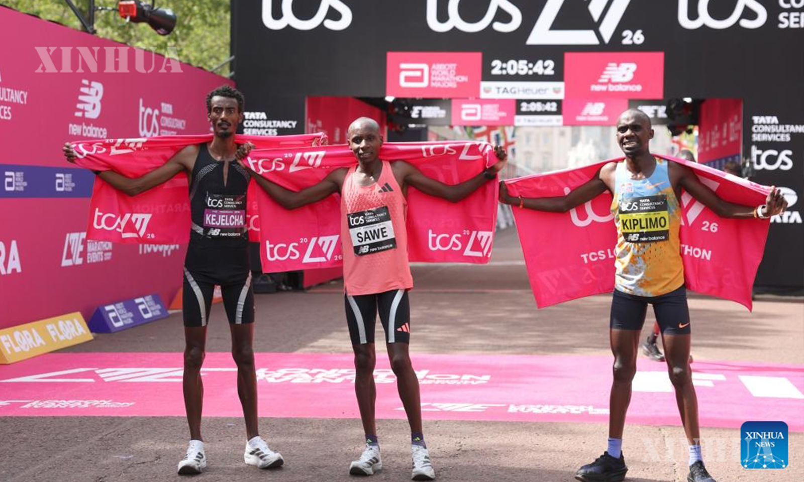 Second placed Ethiopia’s Yomif Kejelcha, winner Kenya’s Sabastian Sawe, and third placed Uganda’s Jacob Kiplimo (L to R) pose after the men’s elite race at the London Marathon in London, Britain, April 26, 2026. (Xinhua/Li Ying)