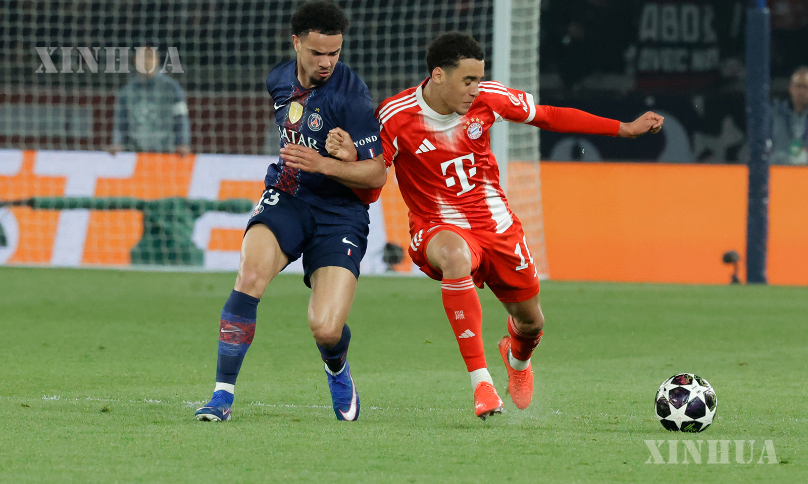 PSG’s Warren Zaire-Emery (L) vies with Bayern Munich’s Jamal Musiala during the UEFA Champions League semi-final first leg football match between Paris Saint-Germain (PSG) and Bayern Munich at the Parc des Princes in Paris, France, April 28, 2026. (Photo by Henri Szwarc/Xinhua)