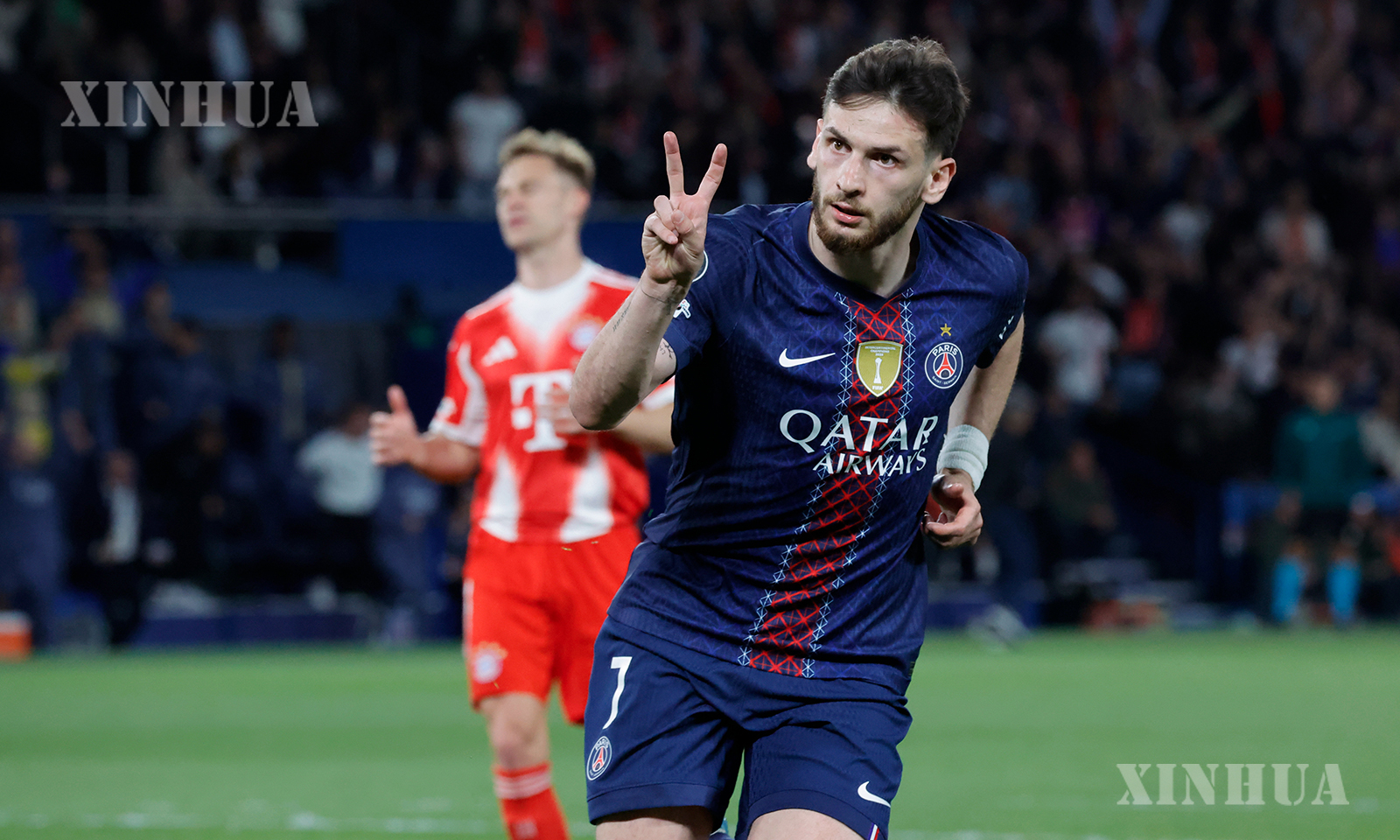 ပြင်သစ်နိုင်ငံ ပဲရစ်မြို့ရှိ ပါ့ခ် ဒီပရင့်စ် အားကစားကွင်း၌ ၂၀၂၆ ခုနှစ် ဧပြီ ၂၈ ရက်က ပီအက်စ်ဂျီနှင့် ဘိုင်ယန်မြူးနစ်အသင်းတို့ ယှဉ်ပြိုင်ကစားသည့် ယူအီးအက်ဖ်အေ ချန်ပီယံလိဂ် ဆီမီးဖိုင်နယ် ပထမအကျော့ပွဲစဉ်၌ ပီအက်စ်ဂျီအသင်းမှ ခဗစ်ချာ ခဗာရက်စကယ်လီယာ ဂိုးသွင်းပြီးနောက် အောင်ပွဲခံနေစဉ် (ဆင်ဟွာ)