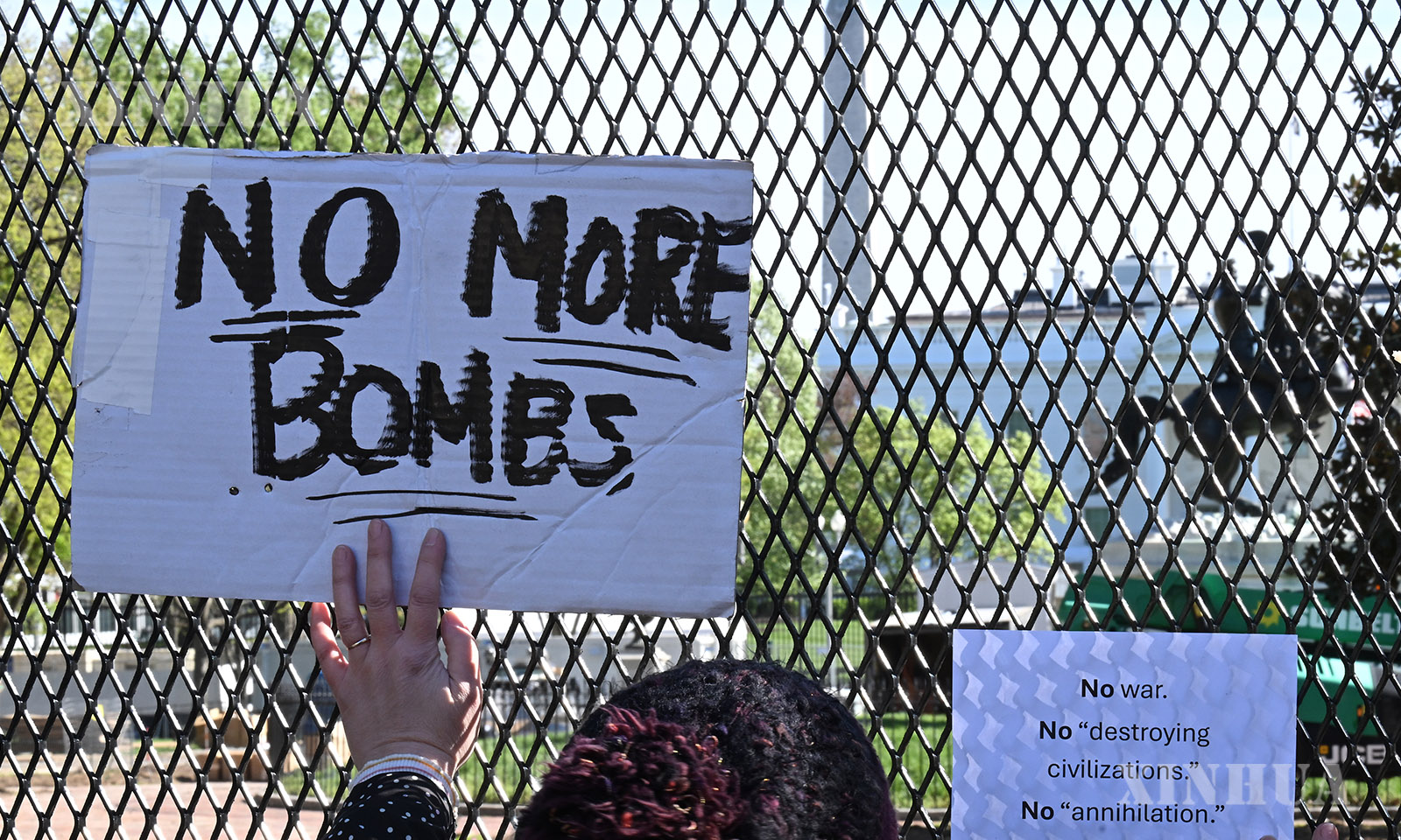 အမေရိကန်နိုင်ငံ မြို့တော်ဝါရှင်တန်ရှိ အိမ်ဖြူတော်ရှေ့တွင် စာတန်းများ ကိုင်ဆောင်ကာ ဆန္ဒပြနေသူတစ်ဦးအား ၂၀၂၆ ခုနှစ် ဧပြီ ၇ ရက်က တွေ့ရစဉ် (ဆင်ဟွာ)