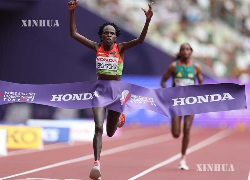 Peres Jepchirchir of Kenya crosses the finish line to win the women’s marathon final at the 2025 World Athletics Championships in Tokyo, Japan, on Sept. 14, 2025. (Xinhua/Jia Haocheng)