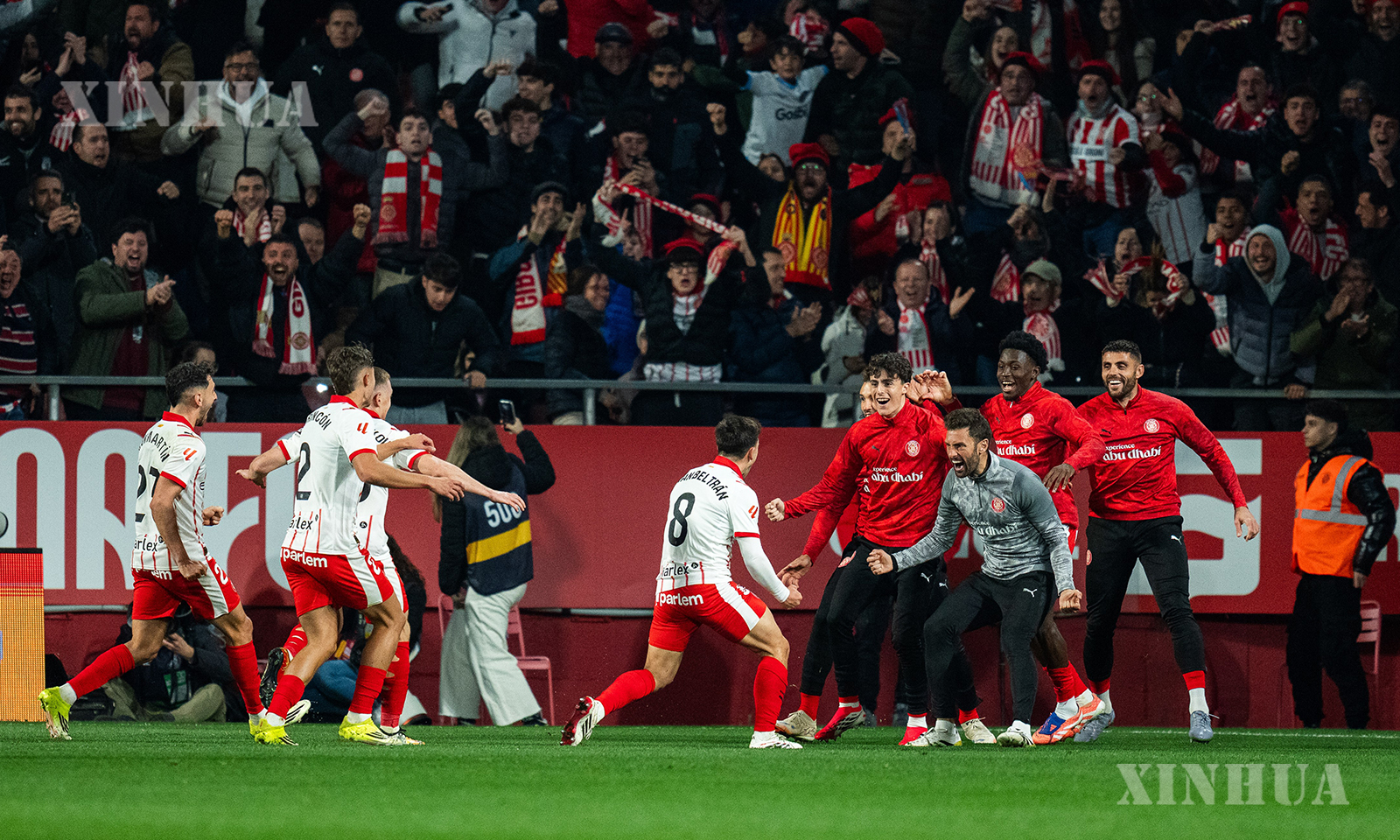 စပိန်နိုင်ငံ ဂျီရိုနာမြို့တွင် ၂၀၂၆ ခုနှစ် ဖေဖော်ဝါရီ ၁၆ ရက်က ဂျီရိုနာနှင့် ဘာစီလိုနာအသင်းတို့ ယှဉ်ပြိုင်ကစားသည့် လာလီဂါဘောလုံးပွဲစဉ်၌ ဂျီရိုနာအသင်းမှ ကစားသမားများ ဂိုးသွင်းပြီးနောက် အောင်ပွဲခံနေစဉ် (ဆင်ဟွာ)