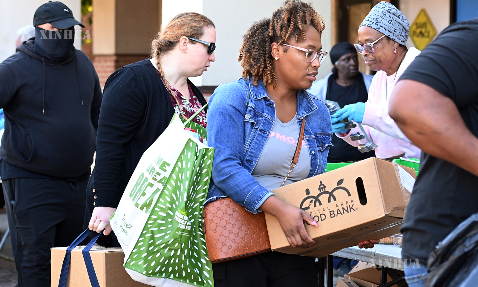 အမေရိကန်နိုင်ငံ မေရီလန်းပြည်နယ် Hyattsville မြို့တွင် အစိုးရဝန်ထမ်းများက အခမဲ့စားသောက်ဖွယ်ရာများ ရယူနေသည်ကို ၂၀၂၅ ခုနှစ် အောက်တိုဘာ ၂၁ ရက်က တွေ့ရစဉ် (ဆင်ဟွာ)