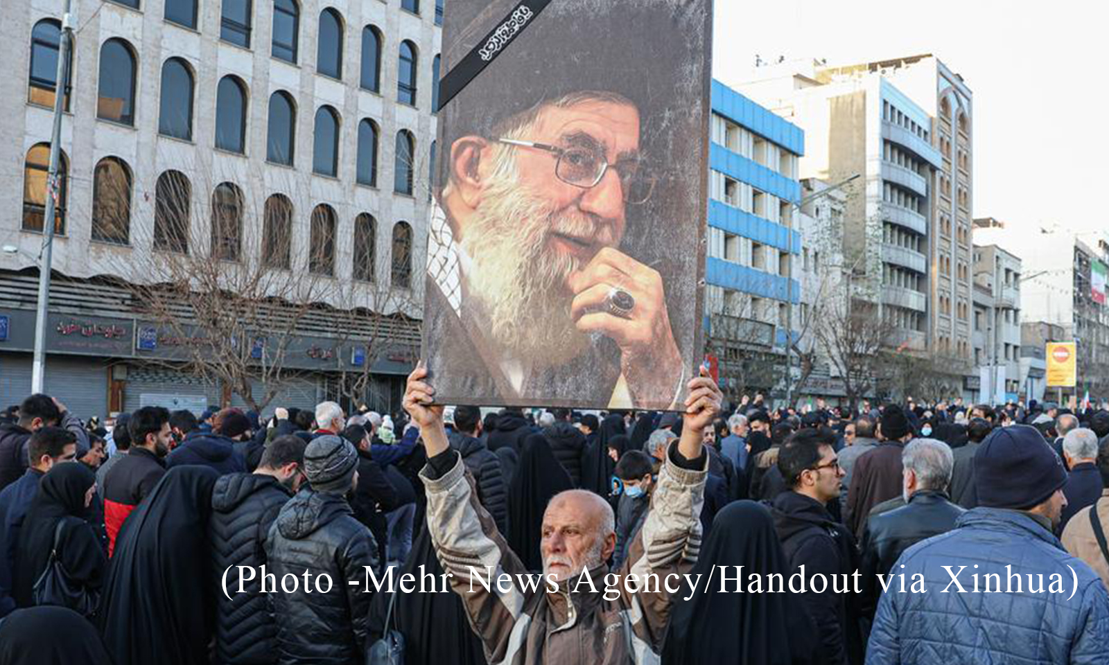 အီရန်ထိပ်တန်းခေါင်းဆောင် အယာတိုလာ အလီခါမေနီ သေဆုံးမှုကြောင့် အီရန်နိုင်ငံ တီဟီရန်မြို့၌ စုဝေးကာ ဝမ်းနည်းပူဆွေးနေသူများအား ၂၀၂၆ ခုနှစ် မတ် ၁ ရက်က တွေ့ရစဉ် (ဓာတ်ပုံ- Mehr News Agency/Handout via Xinhua)